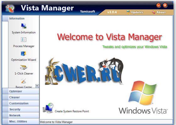 Вышла новая версия программы-оптимизатора для Windows Vista. Она включает более 30 утилит, предназначенных для ускорения работы системы и повышения ее стабильности и безопасности. Программа выдает подробную информацию обо всех компонентах компьютера и о запущенных процессах. С помощью Vista Manager можно ускорить запуск и завершение работы системы, произвести поиск ненужных и дублирующихся файлов и удалять их, исправить ошибки в реестре, провести дефрагментацию реестра, отключить системные обновления и отчеты об ошибках. Кроме этого, доступно множество операций, связанных с настройкой внешнего вида системы: можно изменить содержание контекстных меню, настроить оповещающие сообщения, задать автоматическую смену обоев. Оптимизирует работу с сетью.