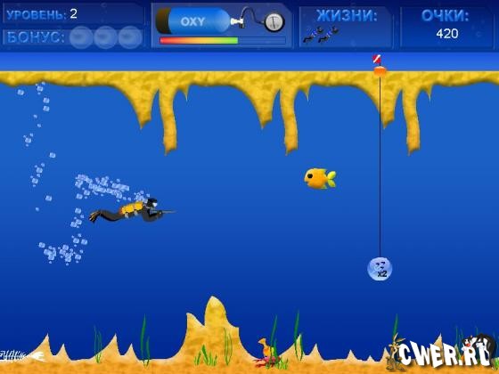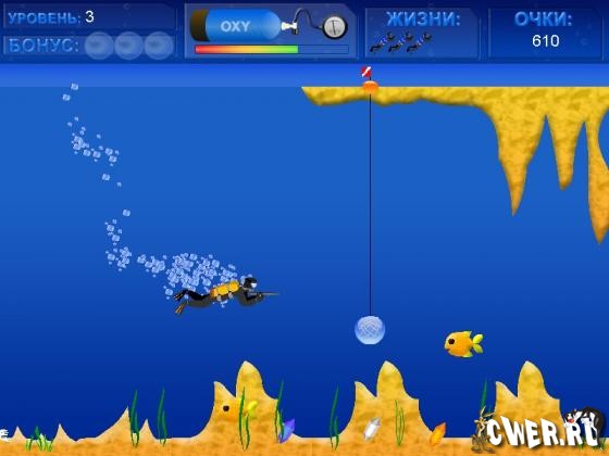 У Вас есть сеть и гарпун. Чтобы не стать рыбьим обедом, используйте их как можно чаще. Не забывайте собирать сокровища с океанского дна. И если не хотите утонуть, следите за уровнем кислорода! Под буйками развешены бонусы. Они помогут Вам в этом безграничном пространстве мирового океана. Вперед на встречу новым ощущениям!