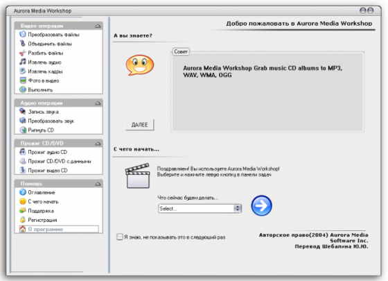 Aurora Media Workshop - является программой, включающий в себя полный спектр средств для работы с видео и аудио файлами. Аудио и видео конвертер, нарезка и соединение треков, граббер аудио CD, извлечение аудио из видео файлов, прожиг CD, создание видео CD из набора фотографий с множеством эффектов перехода, извлечение картинок (фреймов) из видео файлов, граббер DVD (VOB, DAT) в видео форматы, а аудио в MP3, WMA, WAV форматы, поддержка: AVI, MPEG1, MPEG2, ASF, WMV, VOB, DAT, DivX, XviD, MP3, WMA, WAV, OGG и других форматов.