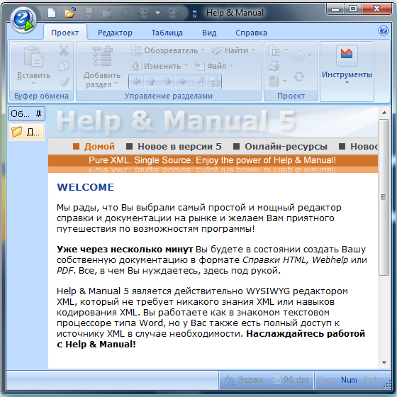 Все типы документов (вместе с данными разделов, оглавлением, предметным указателем и всеми параметрами настройки проекта) создаются и хранятся в единственном файле - проекте.