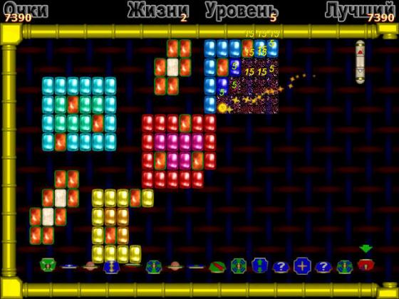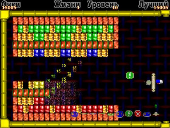 Время от времени из разбитых кирпичей будут выпадать разноцветные бонусы. Собирайте в копилку зеленые и синие, чтобы активировать их в нужный момент, и избегайте красные фишки — они запросто могут уменьшить ракетку и даже отнять одну жизнь.