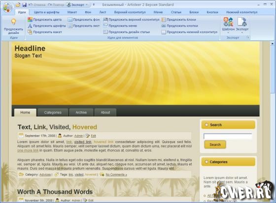 C Artisteer, Вы сразу же становитесь экспертом по веб дизайну, редактируя и нарезая графику, кодируя XHTML и CSS, и создавая шаблоны веб дизайна и тем для Wordpress, Joomla, Drupal - все за несколько минут, без Photoshop'а или Dreamweaver'а, и никаких технических навыков.