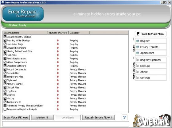 Error Repair Professional - это небольшая утилита для исправления ошибок в настройках операционной системы. Программа обладает высокой скоростью работы и за считанные секунды проверит ваш компьютер на наличие ошибочных записей и сама исправит их. Для продвинутых пользователей присутствует ручной режим работы. Найдет неполадки в реестре, библиотеках данных системы и приложений, а также серьезные ошибки, допущенные пользователем, ставящие безопасность системы под угрозу.