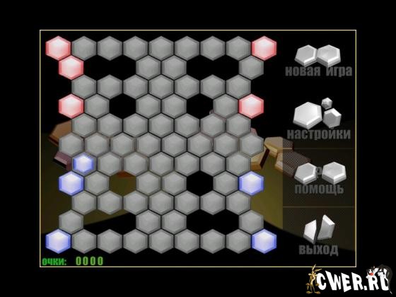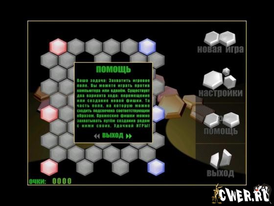Выбрав любое из тридцати игровых полей, попытайтесь захватить его своими фишками, играя с компьютером или живым противником. Правила таковы: у каждого из игроков есть несколько шестиугольных фишек. В свой ход игрок может передвинуть одну фишку - либо на соседнюю клетку (в этом случае фишка дублируется), либо перепрыгнуть через одну.