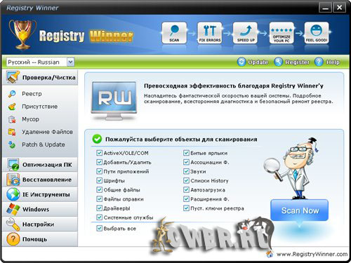 Registry Winner – программа для улучшения работы компьютера, которая находит ошибки, оптимизирует систему и ускоряет ее. Вы можете столкнуться с различными проблемами, которые постепенно появляются с использованием компьютера, например, замедление, зависание, «голубой экран смерти», постоянные сообщения об ошибках и т.д. Registry Winner использует только самые продвинутые технологии для сканирования ваших жестких дисков и дает вам наиболее полную диагностику всего за несколько секунд. Как только проблемы обнаружены приложением, Registry Winner предложит вам профессиональное и высокоэффективное решение для вашего компьютера.