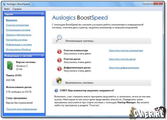 AusLogics BoostSpeed - популярная утилита для ускорения работы системы Windows, программ и Интернет-соединения от компании AusLogics. Программа оптимизирует компьютерную память, ускоряет загрузку Windows, повышает быстродействие Microsoft Office, The Bat, FireFox, Opera, Skype, чистит реестр и диск компьютера. Четвертая версия программы включает в себя знаменитый Auslogics Disk Defrag и набор новых утилит для современных компьютеров. После дефрагментации реестра BoostSpeed, скорость компьютера возрастет за счет уменьшения фрагментации файлов реестра, уменьшения их размера, а также благодаря устранению ошибок в реестре. Помимо этого данная программа предлагает мощные возможности очистки реестра и диска, что в свою очередь позволит вашему компьютеру работать более быстро и эффективно. Имеет приятный пользовательский интерфейс и поддержку русского языка