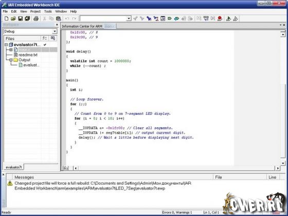 IAR Embedded Workbench for ARM - очень мощный и удобный инструмент программирования микроконтроллеров фирмы Atmel семейства ARM. Это отладочная среда, которая работает под управлением Windows . В нее входят компилятор языка Си, ассемблер, компоновщик, и отладчик, при этом возможно взаимодействие с внешними программами. Встроенный редактор специально настроен на синтаксис языка Си, а дополнительные утилиты и хорошая встроенная система помощи дополнительно облегчают написание программ.