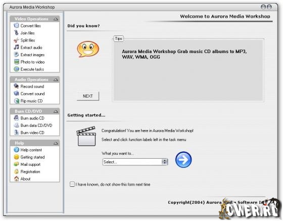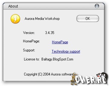 Aurora Media Workshop - набор инструментов для выполнения всех основных операций с видеофайлами - резки, склейки, конвертирования в другой формат, сохранения кадра в отдельный графический файл и т.п. Позволяет конвертировать медиафайлы (AVI, MPEG1, MPEG2, ASF, WMV, VOB, DAT , DivX, Xvid), производить риппинг аудиотреков, а также записывать с внешних источников. Кроме этого, с помощью Aurora Media Workshop можно записывать Audio CD, Data CD/DVD, Video CD и сохранять собранный образ отдельным ISO-файлом. Для поддержки WMA-формата требуется установленный Windows Media Encoder 9 или выше.