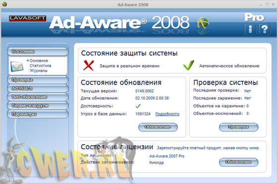 Ad-Aware 2008 Pro предназначена для поиска и устранения шпионских модулей. При своей работе Ad-Aware сканирует оперативную память, файлы на жёстком диске и определяет в них программы-шпионы и запущенные вредоносные процессы. Также сканируется реестр операционной системы. Если в реестре обнаруживается запись, установленная вредоносной программой, то она удаляется. Работает Ad-Aware достаточно шустро, настройки просты и интуитивно понятны. Если обнаруживаются шпионские модули, то программа предлагает удалить их все или выборочно. Для предотвращения случайного удаления нужного файла или записи в реестре предусмотрена функция восстановления (для этого автоматически создаются backup-копии удаляемых данных). Данная программа (или аналог) должна быть у каждого пользователя, который работает на компьютере в Интернете. Проверять и удалять из системы шпионов просто необходимо.