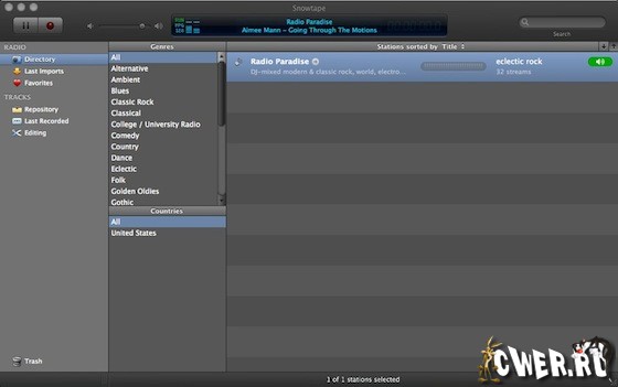 Теперь, со Snowtape — вы сможете записывать свои любимые композиции с интернет-радио налету! При этом, прямо во время после записи, программа найдет для вашего трека подходящую обложку, а по завершении записи позволит отредактировать трек и импортирует его в вашу библиотеку iTunes!