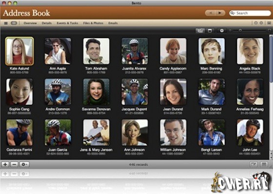 Реализованная в пакете Bento интеграция с программой iPhoto позволяет легко связывать фотографии из личного фотоархива с контактами, проектами, событиями и другой информацией. Альбомы iPhoto автоматически становятся доступными в Bento, отображаясь на вкладке Library. При добавлении новых форм и полей к фотографиям все изменения остаются в среде Bento и никак не отображаются в iPhoto.