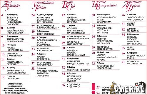 В этом номере вы сможете прочитать об обустройстве погреба и защите скважины, о новинках в выращивании картофеля и броколли, об осеннем наступлении на вредителей и обрезке деревьев, о ежевике, боярышнике, хризантеме, флоксе и многом другом. Как всегда есть кулинарные рецепты и раздел для любителей домашней живности.