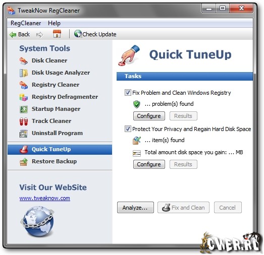 TweakNow RegCleaner помогает очистить реестр от ненужных записей. Все приложения, с которыми вы работаете, при деинсталляции должны убирать все сделанные ими записи в системном реестре. Однако очень многие программы этого не делают. Из-за этого реестр переполняется ненужными записями и разрастается в размерах, что, в свою очередь, приводит к замедлению работы системы. TweakNow RegCleaner быстро сканирует реестр, находит неиспользуемые значения и удаляет их. При этом программа создает файл отката, который поможет восстановить исходные значения в случае, если работа программы вас не устроит.