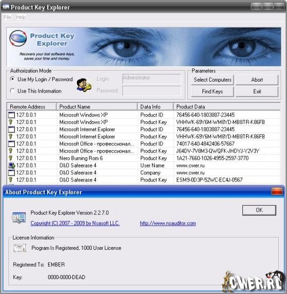 Product Key Explorer - программа позволяет расшифровать, увидеть и сохранить серийные номера продуктов Microsoft, CD-ключи установленных на компьютере программ, и не только их. Неполный список ПО, регистрационные данные которых можно увидеть и сохранить: Microsoft Windows (2000, XP, 2003, Vista), Microsoft Office 2003, Microsoft Office 2007, Microsoft Office XP, Microsoft Visual Studio 2005, Agnitum Outpost Firewall, Macromedia, Ahead Nero, Adobe Photoshop, CyberLink PowerDVD, Borland Delphi, Alcohol 120% и т.д. (поддержка более 500 программ). После запуска программы достаточно будет нажать кнопку поиска ключей и она сама просканирует реестр, и выдаст список программ, установленных на компьютере и регистрационные данные к нем. В программе есть окно для авторизации Администратора, если установлены ограничения на уровне пользователей. Может работать по сети с другими компьютерами и по заданному диапазону IP адресов или по списку IP в текстовом документе.