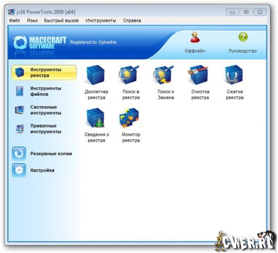 jv16 PowerTools - одна из лучших программ для работы с системным реестром и поддержания в оптимальном состоянии. Включает в себя инструменты для работы с реестром: мощный менеджер реестра - позволяет работать со списком программ из автозагрузки и деинсталляции, со списком зарегистрированных в системе типов файлов, расширений, контекстным меню IE (с тем, в которое часто вставляют свои пункты менеджеры закачек) и некоторыми другими. Этот менеджер часто помогает вручную удалить остатки после автоматической очистки реестра программы. Возможно использование в локальной сети.