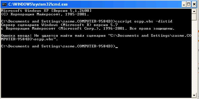 4. ВАЖНО: если выдаст ошибку типа команда не распознана или там файл скрипта не найден, просто копируем файлик OSPP.VBS из C:\Program Files\Microsoft Office\Office14 туда, откуда у вас запускается командная строка (у меня это каталог C:\Users\Administrator) и вводим команду по-новой. В результате вы получите Installation ID для оффлайн-активации