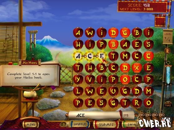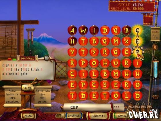 В игре вы познакомитесь с множеством хайку, принадлежащих перу великих поэтов древности. Ваша задача осталась такой же, как и в буквоеде – вы должны составлять слова из букв на игровом поле. Первая буква составленного слова откроется в хайку, которое вам предложат (при условии, что она там есть). Вы в любой момент можете дополнить хайку недостающими буквами, если уже догадались о них. После того как вы правильно разгадаете хайку, вам покажут имя его автора.