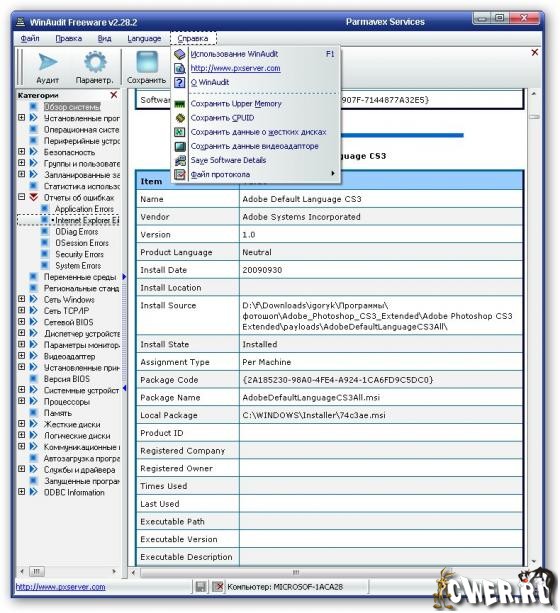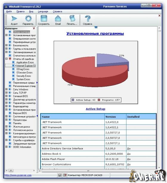 WinAudit - программа для проведения анализа конфигурации компьютера и установленного на нем программного обеспечения, а также проверки сетевых настроек, конфигурации системы безопасности и т.д. Работает без инсталляции, выдает подробный отчет в своем окне с возможностью сохранить его в форматах TXT, HTML, CSV или PDF.