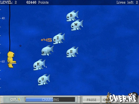 Эта игра очень отличается от остальных. Ее цель — познакомить с английской раскладкой клавиатуры и увеличить скорость набора. Водолаз погружается в пучины морей и океанов, наполненные акулами. На каждой акуле написано какое-то слово, и его нужно набрать до того, как они доберутся до нашей маленькой фигурки. Чем больше акульих атак мы отбиваем, тем глубже погружаемся. А акул все больше и больше, слова длиннее и длиннее...