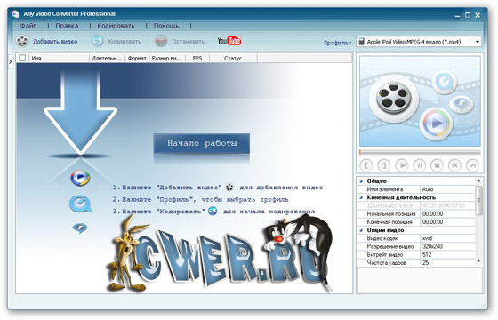 Any Video Converter Professional - это программа для конвертирования видео файлов. Она позволяет перекодировать популярные видео форматы (AVI, MOV, RM, MPEG, DVD, WMV, MP4 и FLV) в DVD, VCD, MP4 или FLV. В утилите присутствует возможность использовать для кодирования файлов как готовые профили с установленными параметрами видео, которые ориентированы на определенные устройства (бытовой DVD-проигрыватель, мобильный телефон), так и самостоятельно подбирать свои настройки конвертирования. Перед началом кодирования видео, его можно просмотреть во встроенном проигрывателе. В программе есть функция конвертирования только выбранного участка видео файла, для чего во встроенном плеере достаточно указать начало и конец нужного отрезка. Программа имеет мультиязычный интерфейс, включая русский язык.