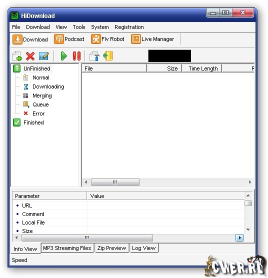 HiDownload - менеджер загрузок. Поддерживает работу по протоколам HTTP, FTP, RTSP (Windows Media), PNM, MMST и MMSU (это значит, что потоковое аудио - RA, RM и Apple Quicktime Streaming - можно "скачать" без проблем). Может работать через прокси, позволяет просматривать архивы и скачивать из них только необходимые файлы, позволяет сохранять Flash, имеется встроенный поиск MP3-файлов.