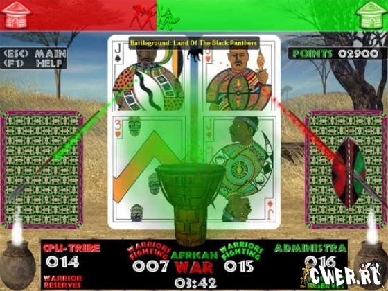 Увлекательная карточная война на фоне потрясающего африканского ландшафта несомненно привлечет ваше внимание ошеломляющей 3D графикой, эффектами и оригинальной музыкой африканских племен. Из четырех режимов игры вы можете выбрать как быструю схватку, так и продолжительные военные действия, которые будут идти до тех пор, пока один из игроков не захватит в плен всех оставшихся воинов. Это война!