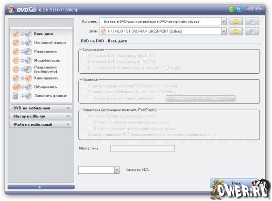 DVDFab – мощный, многофункциональный программный продукт для копирования DVD дисков с возможностями гибкой обработки видеопотока. Программа является одной из лучших на сегодняшний день, из инструментов для копирования, разбиения, пережатия и конвертирования DVD дисков с фильмами. Снимает все защиты и ограничения с диска и при желании пережмет диск большой емкости и вместит его в обыкновенную пустую DVD болванку с минимальными потерями качества (DVD9->DVD5) или разобъет фильм на два диска с полным переносом его меню, удалит всю рекламу, запишет только фильм и многое другое. Программа имеет интуитивно понятный, мультиязычный интерфейс включая русский.