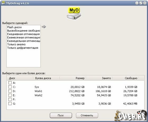MyDefrag - представляет собой дисковый дефрагментатор и оптимизатор для Windows 2000, 2003, XP, Vista, 2008, а также Win7. Быстрый и нетребовательный к ресурсам, MyDefrag использует MS API, обладает несколькими стратегиями оптимизации и может дефрагментировать флоппи- и USB-диски, карты флэш-памяти и вообще все устройства, распознаваемые системой как диск.