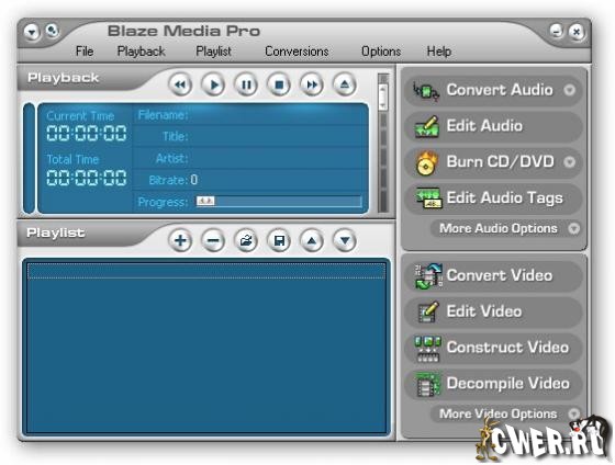 Blaze Media Pro - мультимедийная программа класса "все в одном". Предназначена для записи, редактирования, конвертации и прослушивания аудио, а также просмотра/конвертации видео и анимации. Поддерживаются такие распространенные форматы, как аудио-CD, MP3, WAV, AVI, QuickTime, video-CD, Multi-Page TIFF, FLIC, MIDI, AIFF, AU, SND и другие, а также запись с любых внешних источников звука.