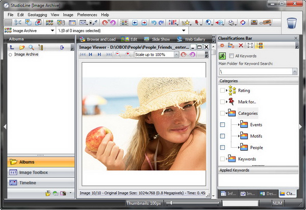 Программа поставляется с внушительным набором профессиональных инструментов редактирования. Несколькими простыми действиями вы можете превратить набор изображений в слайд-шоу, открытки, календари и обложки для компакт-дисков,записать на CD/DVD или отправить их друзьям и родственникам по электронной почте.Кроме того, StudioLine Photo Classic имеет встроенные обширные функций печати для любого формата и размера изображений. StudioLine генерирует блестящие эскизы,размеры которых можно менять в слайдере от 50х50 до 1000х1000 пикселей.