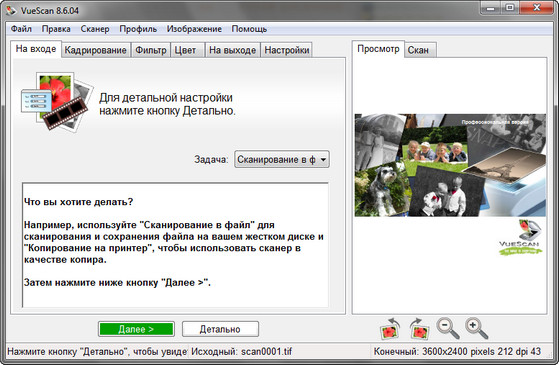 VueScan Pro - программа для работы со сканерами HP, Minolta, Nikon, Polaroid, Epson, Canon и другими. Может работать с внутренней глубиной цвета. VueScan поддерживает автоматическую и ручную настройку большинства параметров и пакетный режим сканирования. Поддерживается более 500 моделей сканеров с определенным перевесом в сторону слайд-сканеров — Nikon, Minolta, Polaroid, Microtek, Epson. Предусмотрено автоматическое удаление дефектов изображения за счет канала инфракрасного сканирования и многопроходное сканирование с последующим усреднением результата — для подавления собственных шумов сканера. Имеются фильтры подавления зерна, нерезкого маскирования и удаления паразитного оттенка оригинала. Есть средства ручной корректировки динамического диапазона и градационной характеристики (независимо по каналам R, G, B).