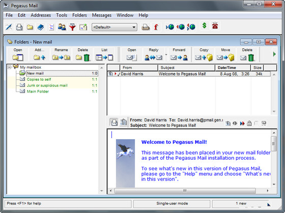 - View your folders in either a multi-pane mode (like the "other" mailer) or in Pegasus Mail's powerful "classic" mode, where each folder has its own window and can be manipulated separately. Switching between these views is as simple as clicking a single button