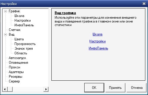 Утилита для мониторинга интернет-трафика. Программа позволяет отображать график входящего и исходящего трафика, а также время, проведенное пользователем в сети. Утилита ведет статистику, где можно просмотреть расход трафика в какой-либо определённый день и час. BitMeter содержит встроенный калькулятор, рассчитывающий время загрузки файла по его размеру или размер файла по времени загрузки. В программе присутствует опция звукового сопровождения различных событий. Например, можно выставить звуковой сигнал, если превышен лимит входящего/исходящего трафика.