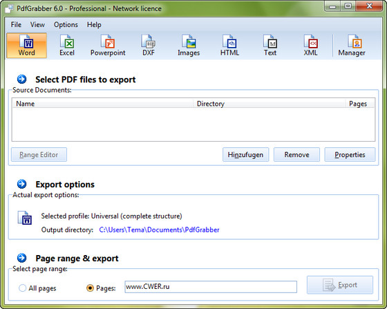 Немецкая программа PdfGrabber Professional позволяет легко и просто конвертировать PDF-документы во все ключевые форматы и обратно в PDF, посредством виртуального PDF-принтера . При конвертации сохраняет примененные оригинальные шрифты документа, вложения и форматирование. Имеет своего редактора для определения какая часть или элементы документа будут экспортироваться, какие конвертироваться, а какие удалятся (текст, формы, ссылки, аннотации, изображения, цифровые подписи и т.д.). Выбор конвертации всего документа, постранично, диапазона страниц и прочее. Позволяет создавать профили экспорта-конвертирования, автоматический мониторинг входящей папки и различные параметры командной строки и т д.