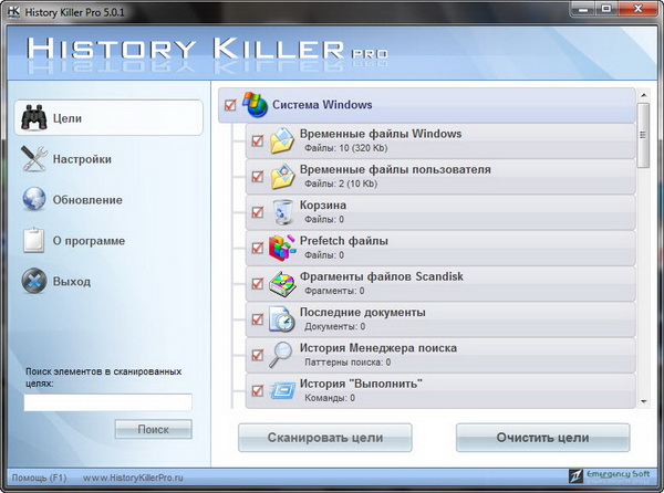 Этот удобный инструмент стирает временные файлы и директории Windows, мусорную корзину, историю поиска Windows, список последних используемых файлов Windows продуктов Windows и программ Microsoft Office, а также временные файлы, историю, формы автозаполнения и cookies Internet Explorer, Mozilla Firefox, Opera и Google Chrome. И с помощью планировщика задач History Killer Pro можно все эти действия автоматизировать.