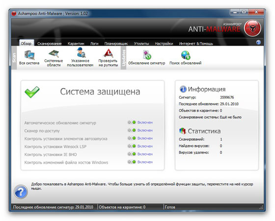 Ashampoo Anti-Malware - утилита, способная находить и удалять разнообразное вредоносное ПО. Программа использует эвристический метод сканирования, позволяющий в реальном времени контролировать безопасность всей системы. Также имеется возможность полного сканирования всех дисков.