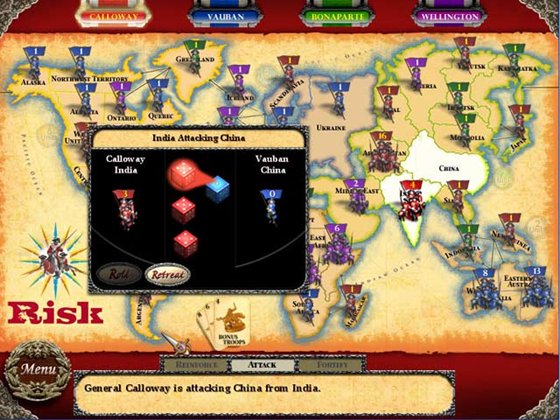 Атакуйте. Защищайте. Отстаивайте свои территории, захватывайте новые – все это, бросив кости всего лишь раз! Выступите в роли генерала одной из армий в этой классической настольной игре с кинепластической музыкой и яркими визуальными эффектами! Сразитесь с компьютерными генералами, у каждого из которых свой стиль и характер, или вступите в сражение со своими друзьями. Даже если Вы не любитель военных стратегий, Вы не сможете остановиться, разрабатывая очередное наступление!