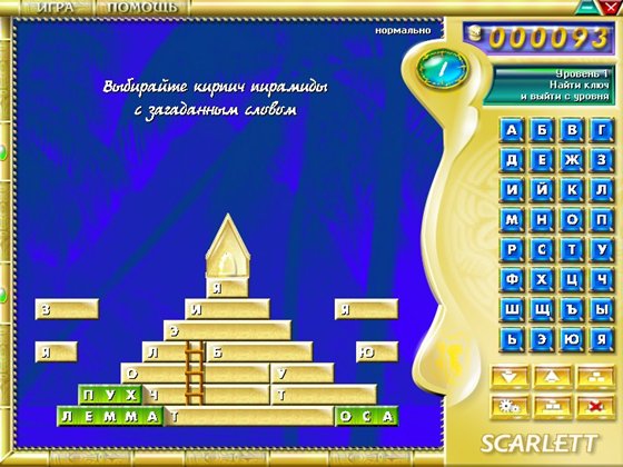 Итак, Вы начали играть - перед Вами пирамида, состоящая из слов, которые нужно разгадать по буквам, чтобы добраться от подножья к вершине. На каждое слово дается ограниченное число попыток угадать букву. На всех уровнях есть основная задача: найти ключ и добраться до выхода.