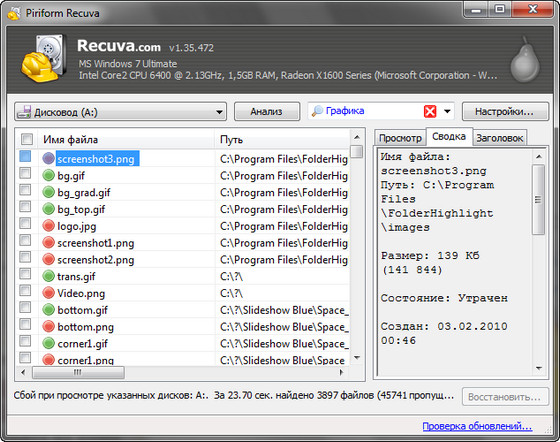 Recuva - небольшая бесплатная утилита, которая предназначена для восстановления файлов, удаленных с ПК случайно или потерянных в результате программного сбоя или ошибки в работе приложений. Проста в использовании, не требует специальных знаний для успешного использования.