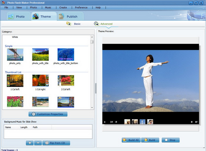 - Добавляет фотографии и музыку. Программа поддерживает JPG, TIFF, BMP и PNG файлы. Вы также можете добавить фоновую музыку в формате MP3, WMA и WAV файлов или непосредственно вырезать и вставлять аудио треки с компакт-диска.