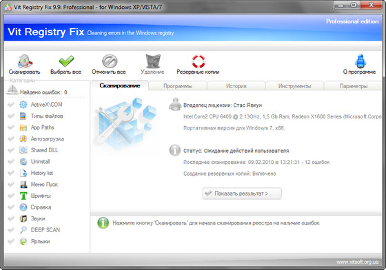 Vit Registry Fix - программа для очистки реестра от ненужных записей (ошибок). Так как после удаления програм в реестре оставляются различные ненужные записи, то со временем этих записей становится все больше и больше и это является причиной долгих задержек перед загрузкой програм, снижение общей производительности системы и других ошибок. Vit Registry Fix находит эти ошибки и разделяет их на категории (ActiveX\COM,Типы файлов, AppPath, автозагрузка, Shared DLL, Uninstall, History list, меню ПУСК, Шрифты, Справка, Звуки, Ключи Software (Deep scan) и дополнительно ищет битые ярлыки на дисках. Также есть возможность ручного удаления ключей из разделов Software (как для HKCU так и для HKLM), создания резервных копий перед удалением ошибок а также можно создать список исключения.