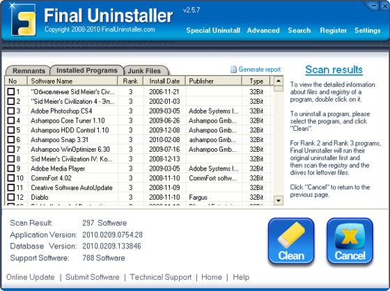 Final Uninstaller - программа позволяет очищать жесткий диск и системный реестр от мусора, оставшегося после удаления каких-либо программ. Программа использует высокоэффективный алгоритм обнаружения, который позволяет быстро просканировать систему и найти ненужные файлы и записи в системном реестре для каждой установленной программы на вашем компьютере. За несколько щелчков мыши программа просканирует ваш жесткий диск и реестр Windows, после чего предоставит вам список приложений, которые были неправильно деинсталлированы. После чего вы сможете выбрать приложения для последующего их полного удаления с компьютера. Программа имеет понятный пользовательский интерфейс и проста в использовании, поэтому подходит для любого пользователя.
