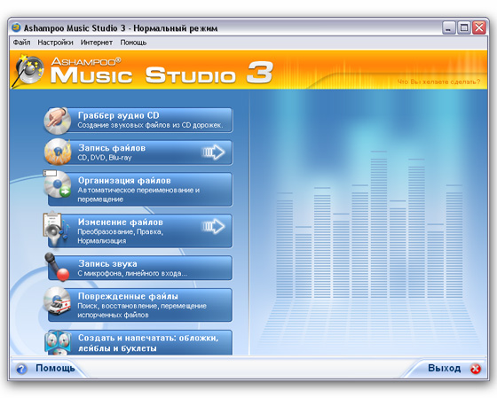 Ashampoo Music Studio - программа, которая необходима всем, кто имеет дело с цифровой музыкой. Это полноценный пакет для работы с аудио файлами, позволяющий копировать аудиодорожки на жесткий диск в форматах WMA, MP3, OGG, FLAC и WAV. Также программа позволяет создавать плейлисты, записывать диски различных форматов (запись аудио CD, запись MP3, запись WMA, запись смешанного формата на CD/DVD/Blu-ray), редактировать аудиодорожки и многое другое.