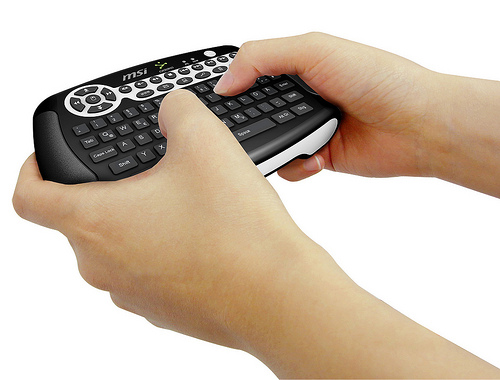 Компания Micro-Star International (MSI) представила беспроводную мини-клавиатуру Air Keyboard. Клавиатура сделана таким образом, что пользователю будет удобно держать ее обеими руками, осуществлять ввод большими пальцами, а также с ее помощью дистанционно управлять домашним медиа-центром.
