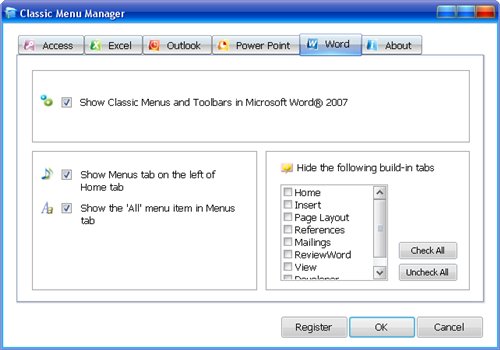 Classic Menu for Office 2007 - программа для тех, кого раздражает новый интерфейс Microsoft Office 2007. Программа возвращает классический интерфейс в пакете Microsoft Office 2007. Надстройка Classic Menu кажется (так и есть на самом деле) очень простой и удобной в использовании. Она не отягощена дополнительными функциями и "весит" гораздо меньше своих конкурентов. Всё, что она делает - это добавляет свою вкладку в ленту и показывает меню и панель инструментов в стиле Office 2003.