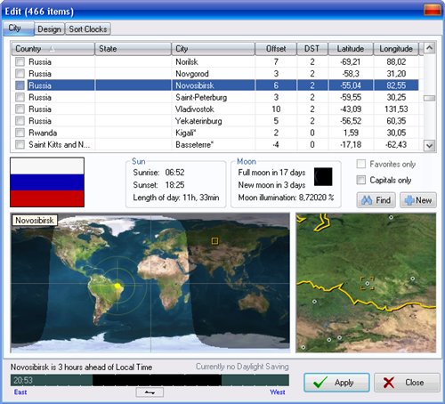 Sharp World Clock - программа, предназначенная для показа мирового времени. Позволяет установить неограниченное число часов в линию или в виде таблицы. Внешний вид часов может иметь различный дизайн, так же часы могут быть цифровыми или обычными, с круглым циферблатом, часы способны показывать флаг страны и изменяемы в размерах от очень маленьких до полноэкранных. Программой поддерживается множество стилей. Настраиваемый список городов каждой страны мира. Вы сможете добавлять, изменять и редактировать города.