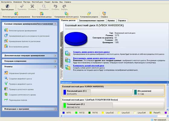 • Резервное копирование, включая секторные и файловые архивы с дифференциальными и инкрементными приращениями, а также эксклюзивную возможность файлового дополнения.