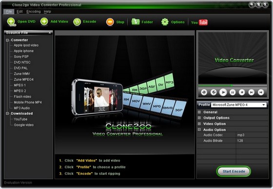 Clone2Go Video Converter Professional - идеальное решение для конвертации видео. С данной программой вы сможете конвертировать любые видео файлы в специальные видео/аудио форматы и просматривать их на iPod, iPhone, PSP, Zune, BlackBerry и других устройствах. Clone2Go Video Converter поддерживает видеоформаты: MOV, WMV, AVI, MKV, FLV, MPG, RM, RMVB, ASF, VOB, DV, 3GP и аудиоформаты: MP2, MP3, WAV, M4A, WMA, OGG. Программа также позволит изменять параметры видеофайлов и может работать как инструмент для скачивания файлов с портала YouTube. Вы сможете скачивать видео файлы с сайтов YouTube и Google на свой компьютер.