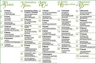 В номере: если участок на склоне, делаем террасы; проект дома для пенсионеров; как экономно отапливать загородный дом; нестандартное жилище для овощей; томаты, картофель, кольраби, калина, снова об обрезке; козлята, ягнята и другая живность - эти и другие темы нашли свое отражение в очередном номере журнала.