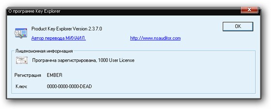 Product Key Explorer позволяет расшифровать и увидеть, а также сохранить серийные номера (Product ID, Product Key, License Info, User Name, Company) продуктов Microsoft, CD-key установленных на компьютере программ, и не только их. Неполный список ПО, регистрационные данные которых можно увидеть и сохранить: Micrsoft Windows (2000, XP, 2003, Vista), Microsoft Office 2003, Microsoft Office 2007, Microsoft Office XP, Micrsoft Visual Studio 2005, Macromedia, Ahead Nero, Adobe Photoshop, CyberLink PowerDVD, Borland Delphi и т.д.
